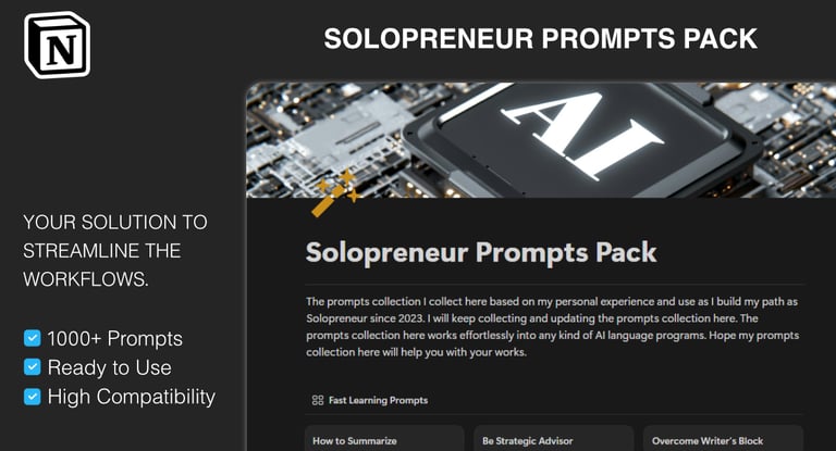 The Solopreneur Prompt Pack is your AI-powered secret weapon—crafted to help you work smarter, not harder. With 1,000+ ready-to-use prompts compatible with any AI language tool (ChatGPT, DeepSeek, Gemini, Claude, and more!).